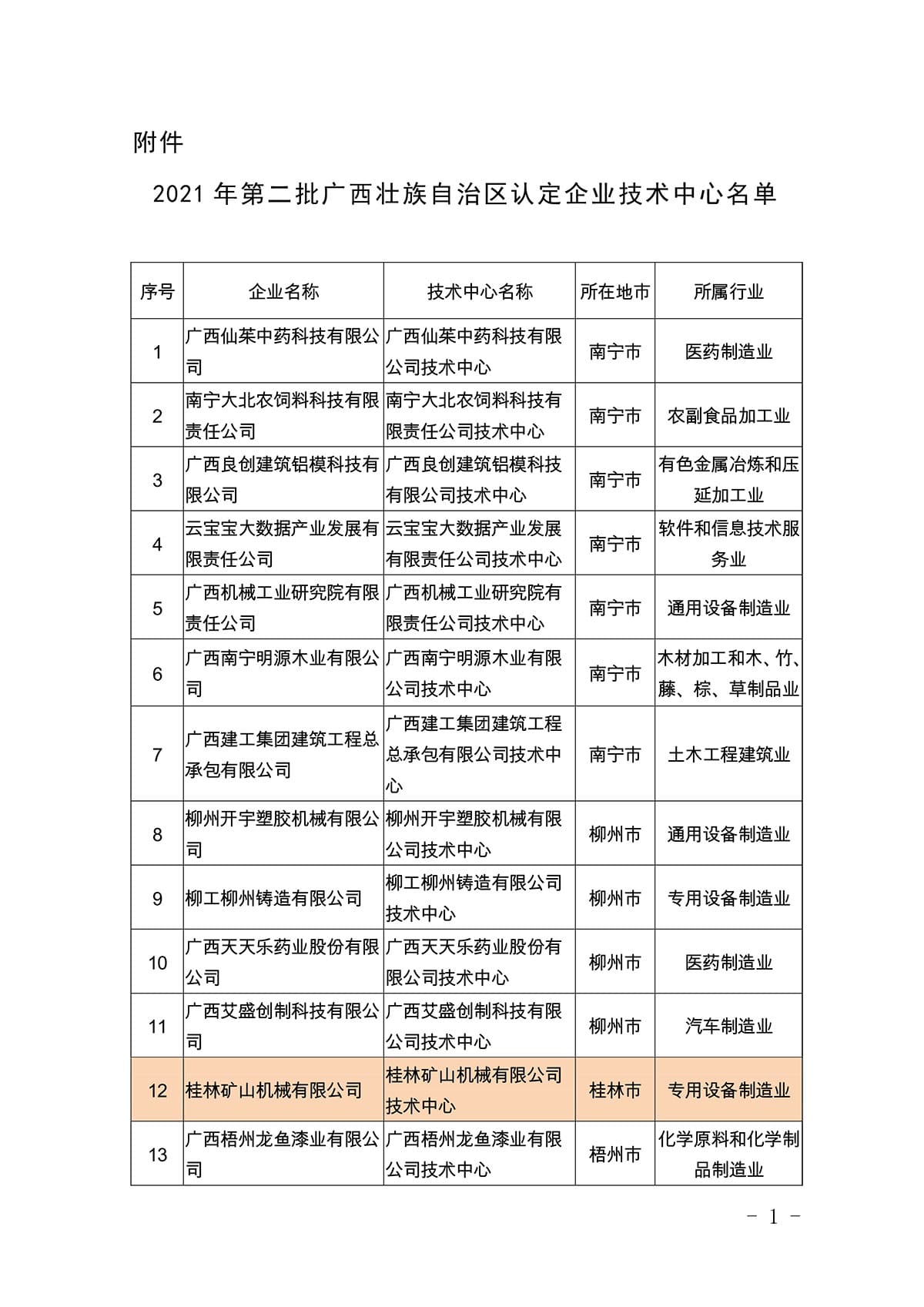 10月29日,自治區(qū)工業(yè)和信息化廳等6部門關(guān)于公布2021年第二批廣西壯族自治區(qū)新認(rèn)定企業(yè)技術(shù)中心名單的通知(桂工信園區(qū)〔2021〕347號),桂林礦山機械有限公司榮列其中,被認(rèn)定為自治區(qū)企業(yè)技術(shù)中心。這標(biāo)志著桂林礦機在科技創(chuàng)新能力,新產(chǎn)品研發(fā)等方面較大的優(yōu)勢,同時體現(xiàn)了公司注重科技投入和技術(shù)創(chuàng)新方面的卓越成就。