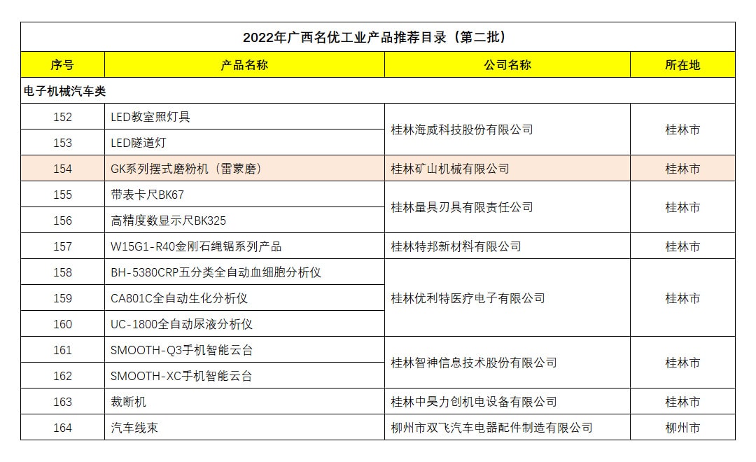 日前,通過(guò)自治區(qū)工業(yè)和信息化廳發(fā)布關(guān)于廣西名優(yōu)工業(yè)產(chǎn)品推薦目錄(第二批)的公示,桂林礦山機(jī)械有限公司擺式磨粉機(jī)產(chǎn)品成功入選《廣西名優(yōu)工業(yè)產(chǎn)品推薦目錄》(第二批)。